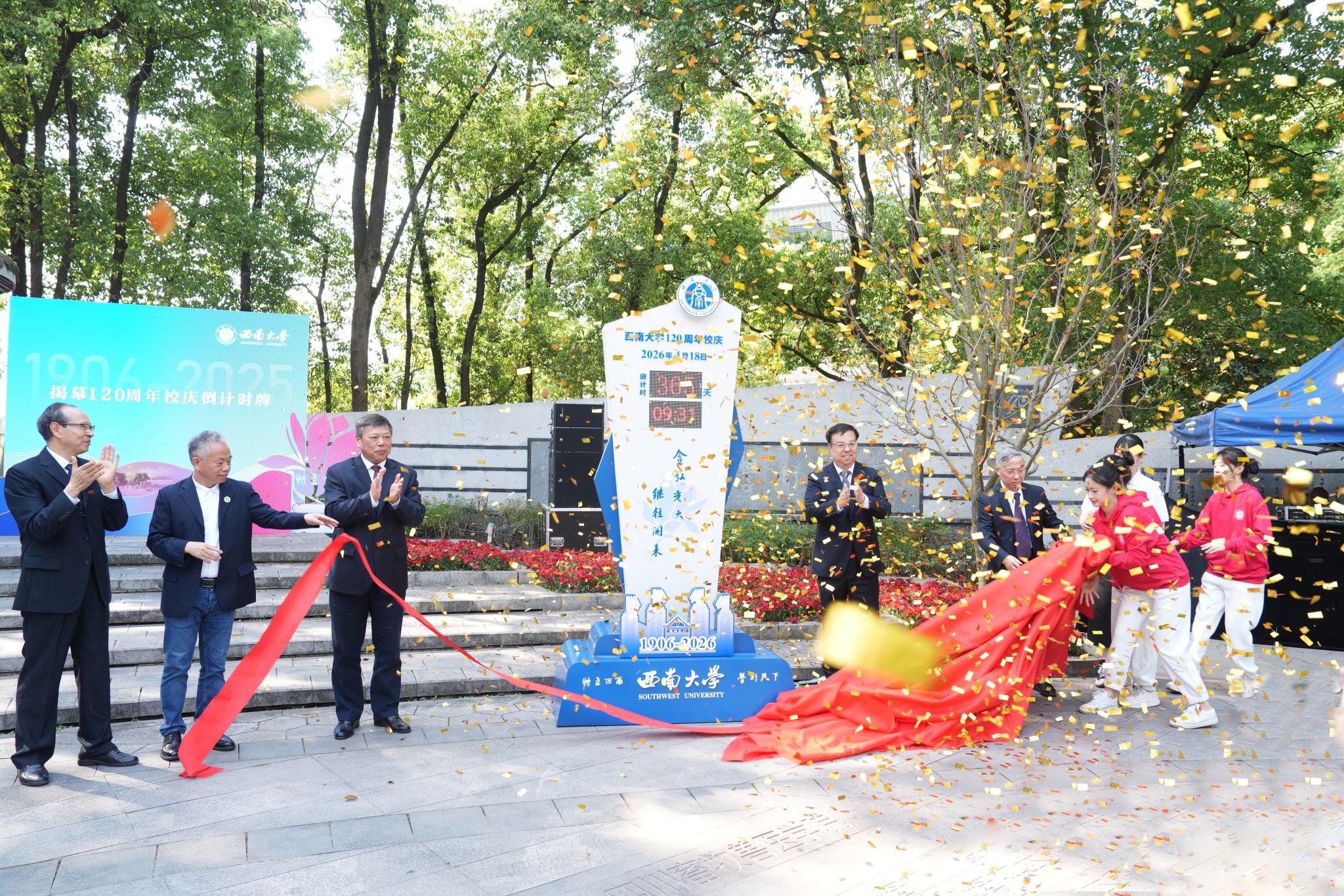 4月18日上午,西南大学120周年校庆倒计时一周年启动仪式在校庆纪念园举行。党委书记张卫国、校长王进军及全体校领导出席仪式。各机关部门、教学科研单位、直附属单位、企业单位负责人以及专家教师代表、校友代表、离退休教师代表、学生代表等200余人到场参加。
